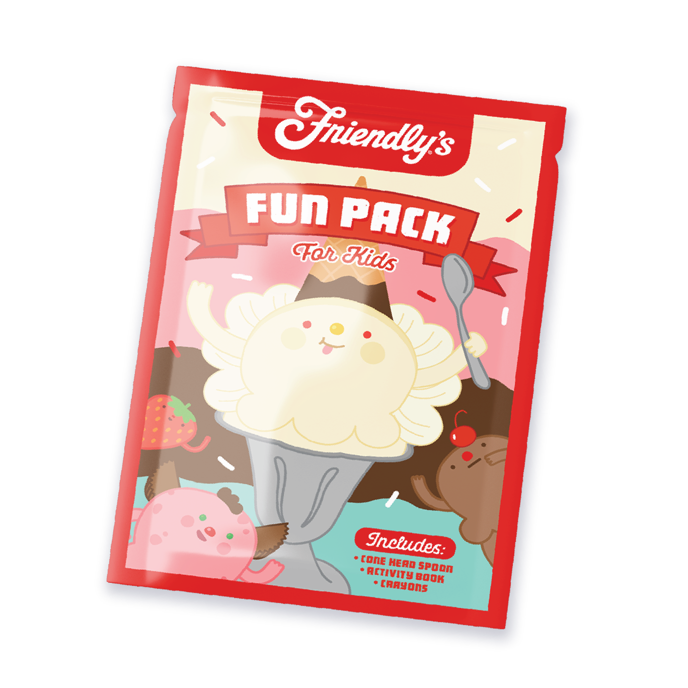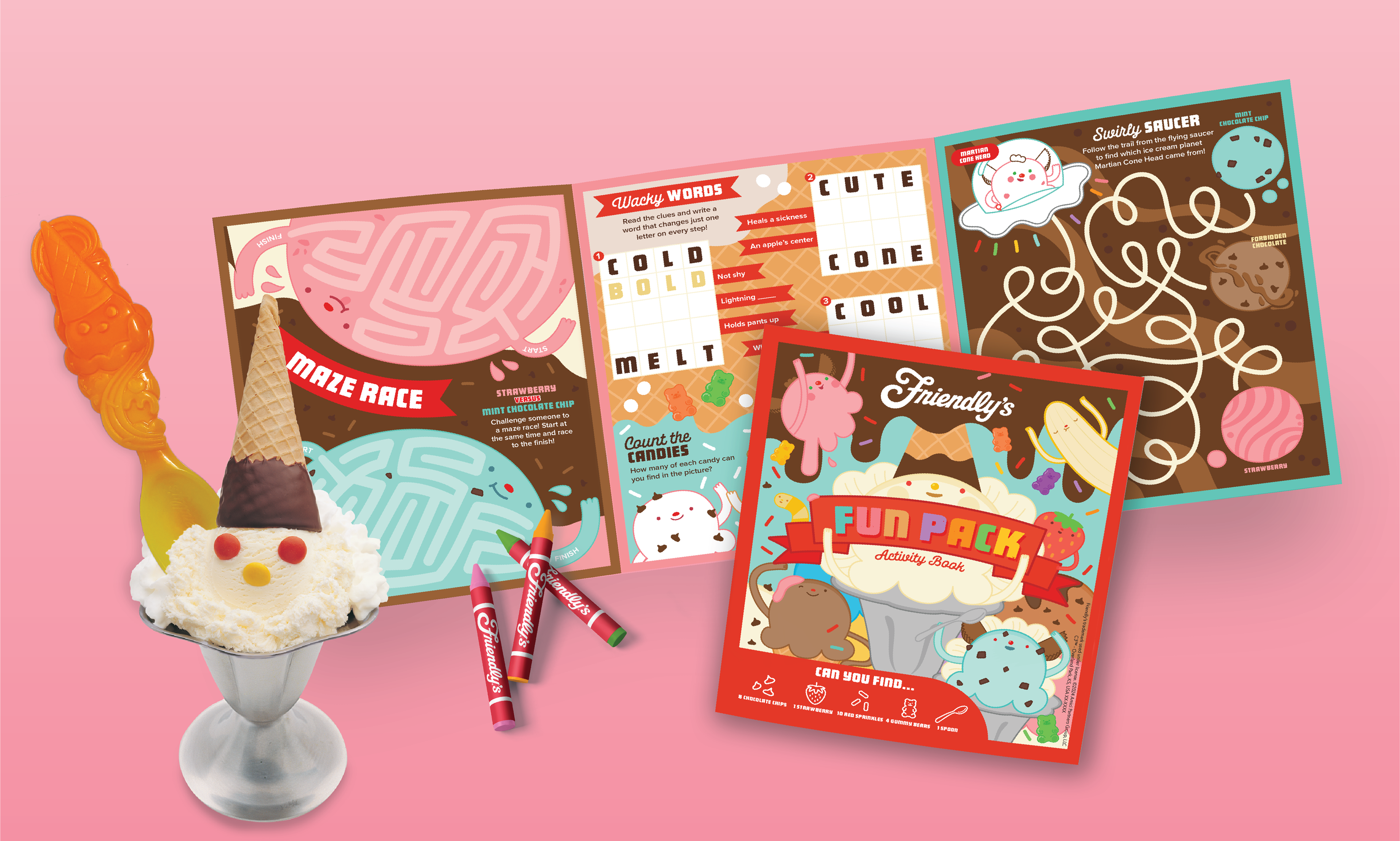 Friendly's "Fun Pack" given out with every kids meal featuring activity book, crayons, and coloring-changing sundae spoon.